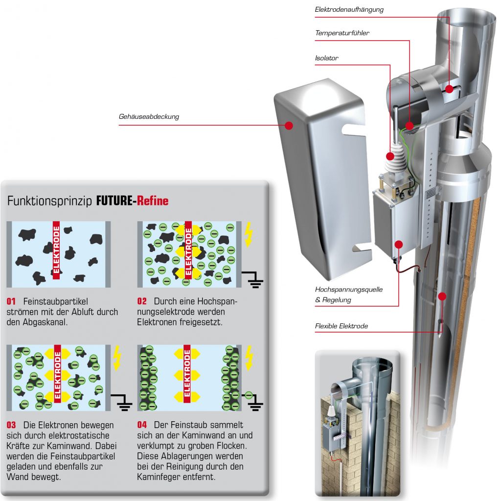 Der Future-Refine ist ein elektrostatischer Feinstaubabscheider, der den Ausstoß an gesundheitsgefährdendem Feinstaub mit Holz betriebener Einzelraumfeuerungen (Kamin-, Pellet und Kachelöfen) oder automatisch beschickter Feuerung erheblich reduziert. Der Abscheider eignet sich für Feuerungsleistungen kleiner 50 kW und erreicht seine maximale Wirksamkeit in Verbindung mit Schräder Edelstahl-Schornsteinsystemen. Die Montage ist kinderleicht und schnell erledigt, so wird der Future-Refine im Mündungsbereich der Abgasanlage installiert. Benötigt wird nur noch ein Stromanschluss zur Versorgung des Filters.