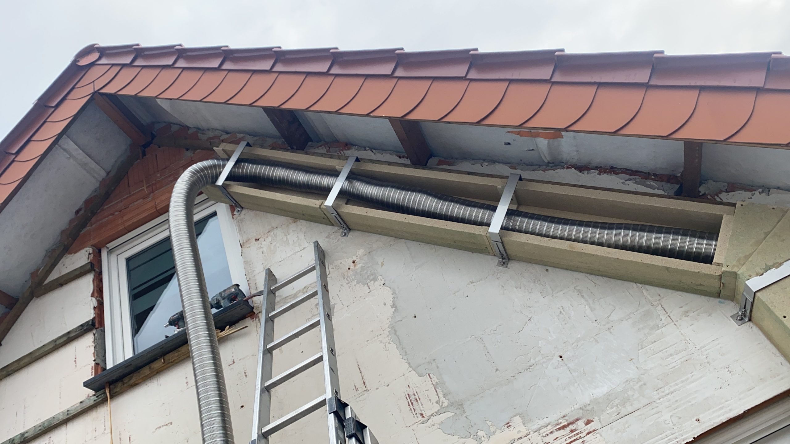 Einzug eines starren oder flexiblen Kunststoff oder Edelstahlrohr in vorhandenen Schornsteinschacht.